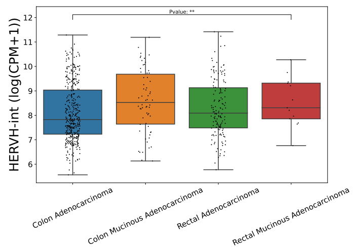 Users can utilize differential expression analysis to discover that HERVH-int is overexpressed in COREAD cancer compared to normal tissues.