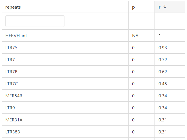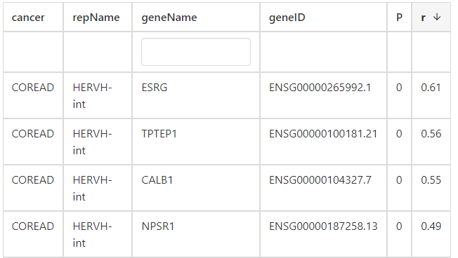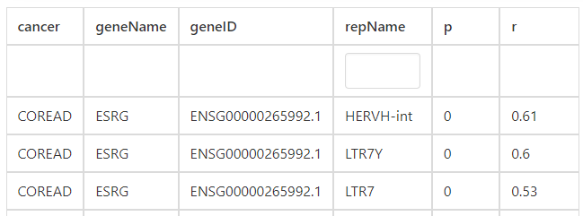 For single gene analysis, users can find correlated ERVs based on Pearson correlation method to find similar ERVs of specific gene. For example, users can find that HERVH-int, LTR7Y, and LTR7 have the highest correlation with ESRG in COREAD cancer type.