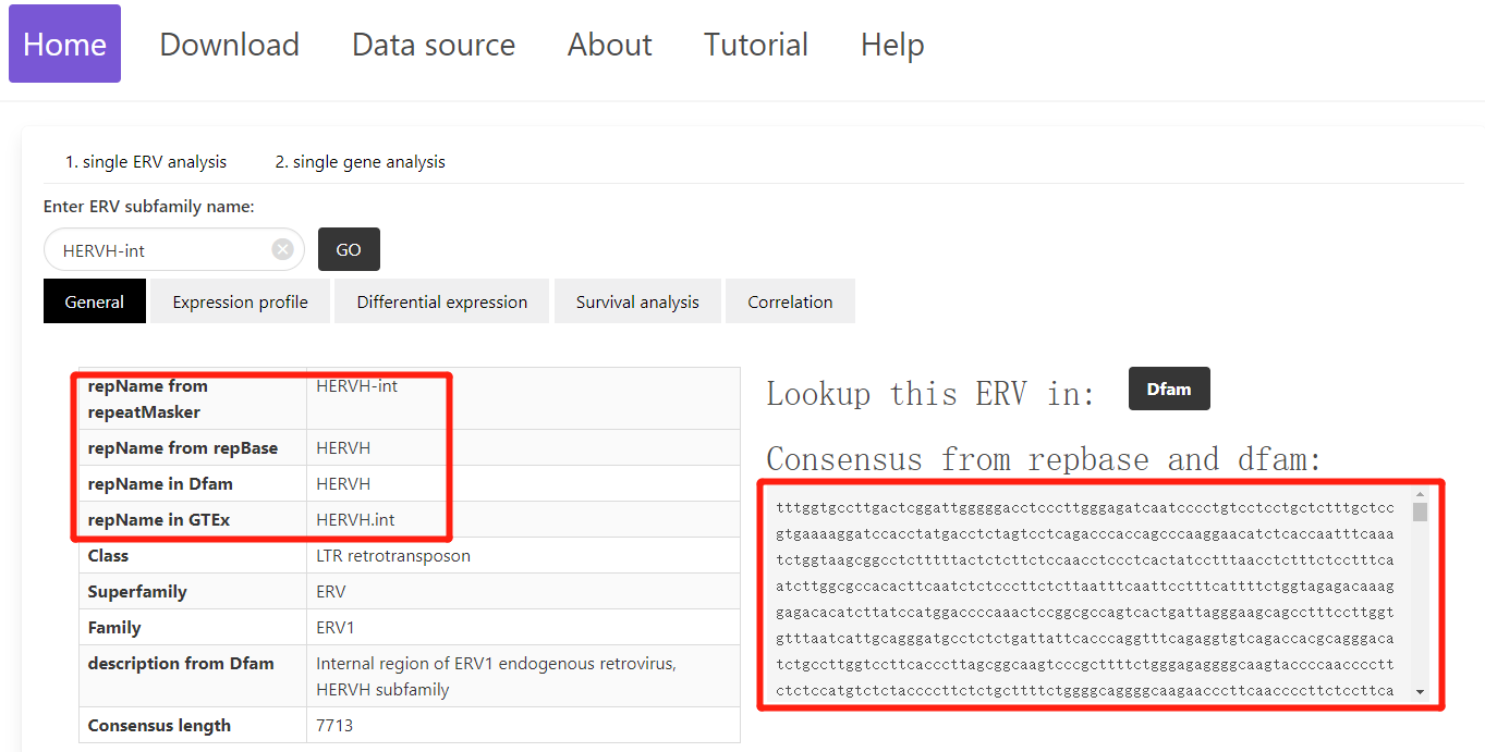 Using ERVcancer, experimental biologists can easily explore the extensive TCGA and CCLE datasets, pose specific research questions, and test their hypotheses. In the "General" section of the single ERV analysis, users can access a comprehensive overview of a specific ERV, including its name across various tools, websites, or datasets, as well as its consensus sequence.